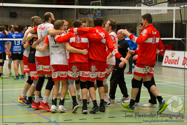 In de 3e set was het opnieuw even zoeken naar de juiste concentratie maar ook hier mocht het zeker ook geen probleem zijn om deze set binnen te rijven. Grappig feit om nog wel mee te geven is dat onze setter Tim De Donder, extra aangemoedigd door onze wisselspelers, probeerde om een jump serve te slaan. Om het nog lief uit te drukken: deze was niet zo geslaagd ;). De bal raakte zelfs nog niet tot aan het net, tot jolijt van alle spelers, supporters, coach en zelfs de scheidsrechters. Zoals je wel merkt, heerst er een fantastische ploeggeest bij onze Duvelboys. Setstand was 25/20.