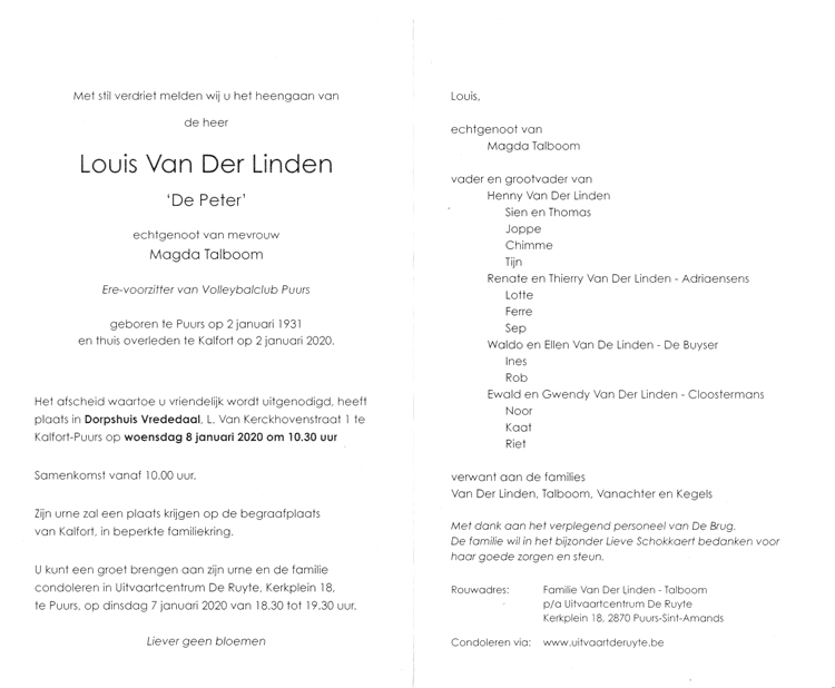 Klik op volgende link voor grote resolutie van de rouwbrief: Rouwbrief Louis Van Der Linden.